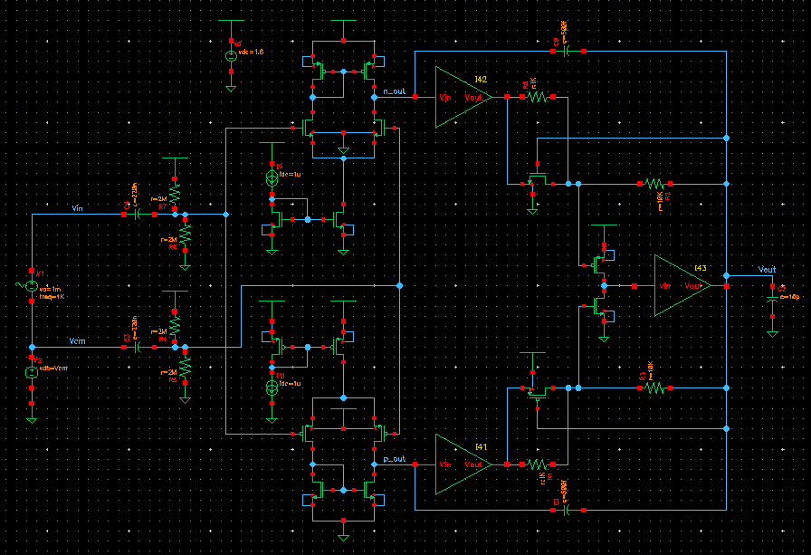 A two-stage 1.8V CMOS biopotential amplifier for a wearable biomedical instrumentation frontend with internal gain enhancement switch feedback. Used the Skywater 130nm Process and simulated with the Cadence Design Suite. Verified 85dB CMRR, 0.15V to 1.7V output range with stable gain, 10µW power, and 100kHz bandwidth.