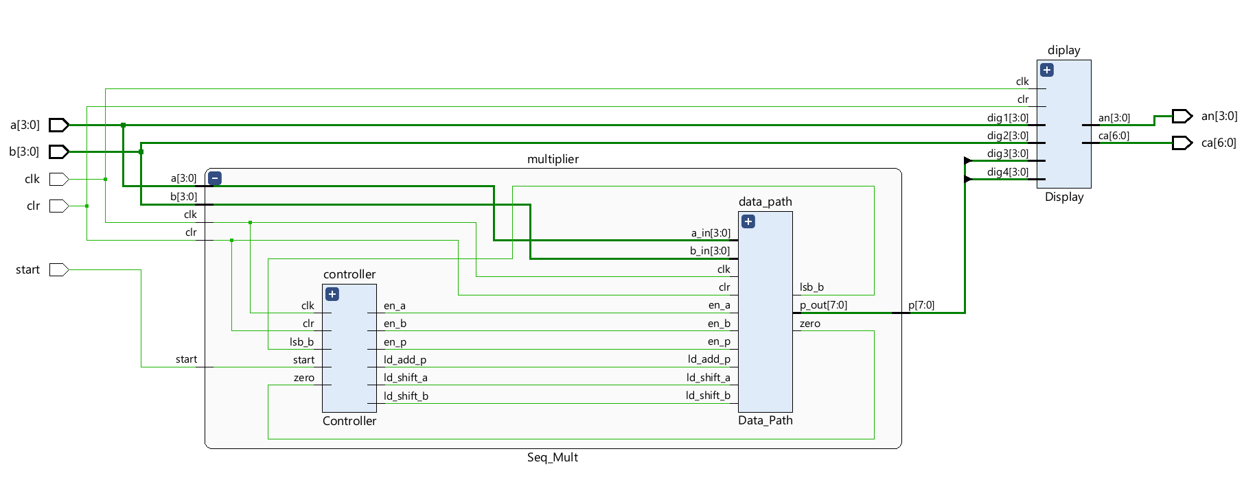 I built a Verilog sequential multiplier with a data path and controller partition designed with finite state machine principles. Simulated with testbench in Vivado and implemented on a Basys 3 Artix-7 FPGA board.